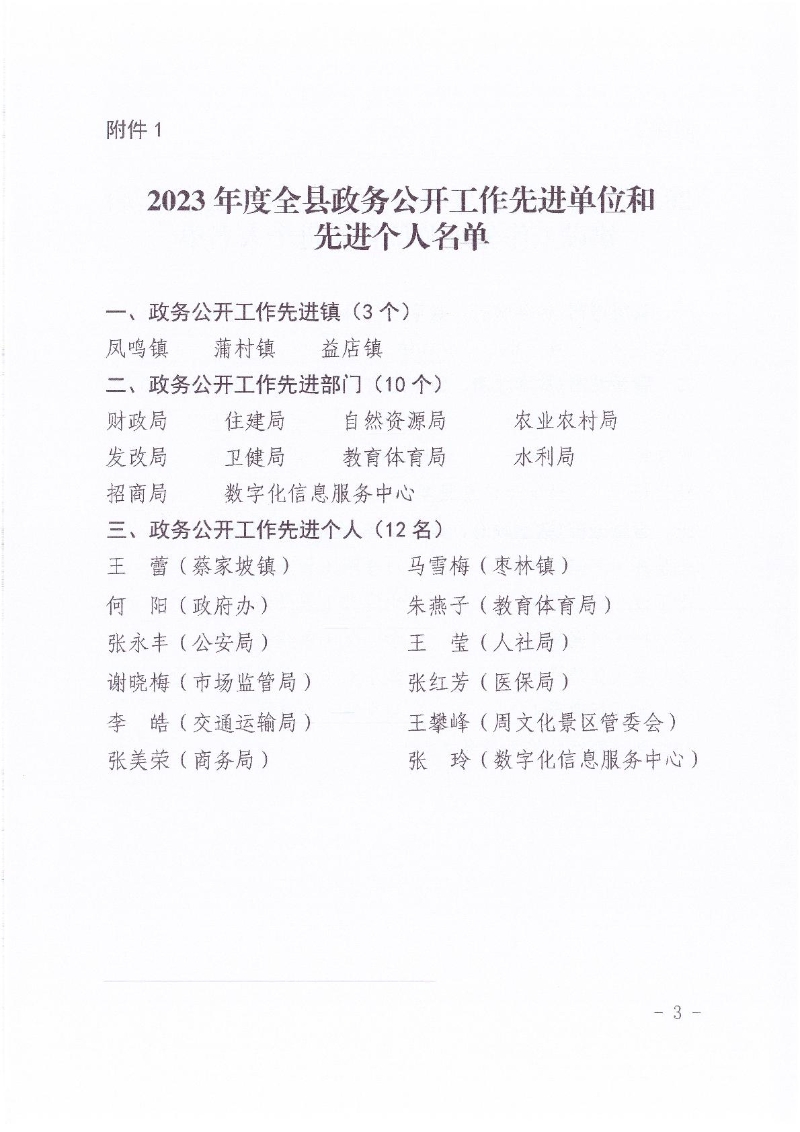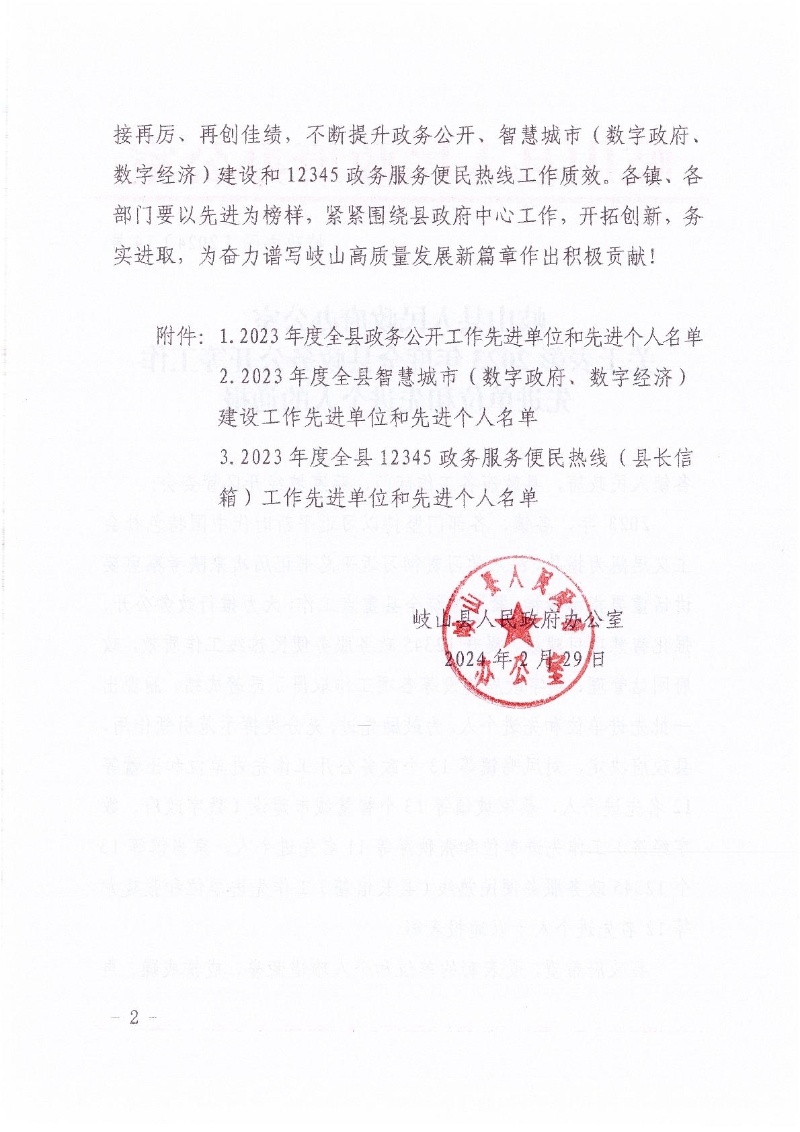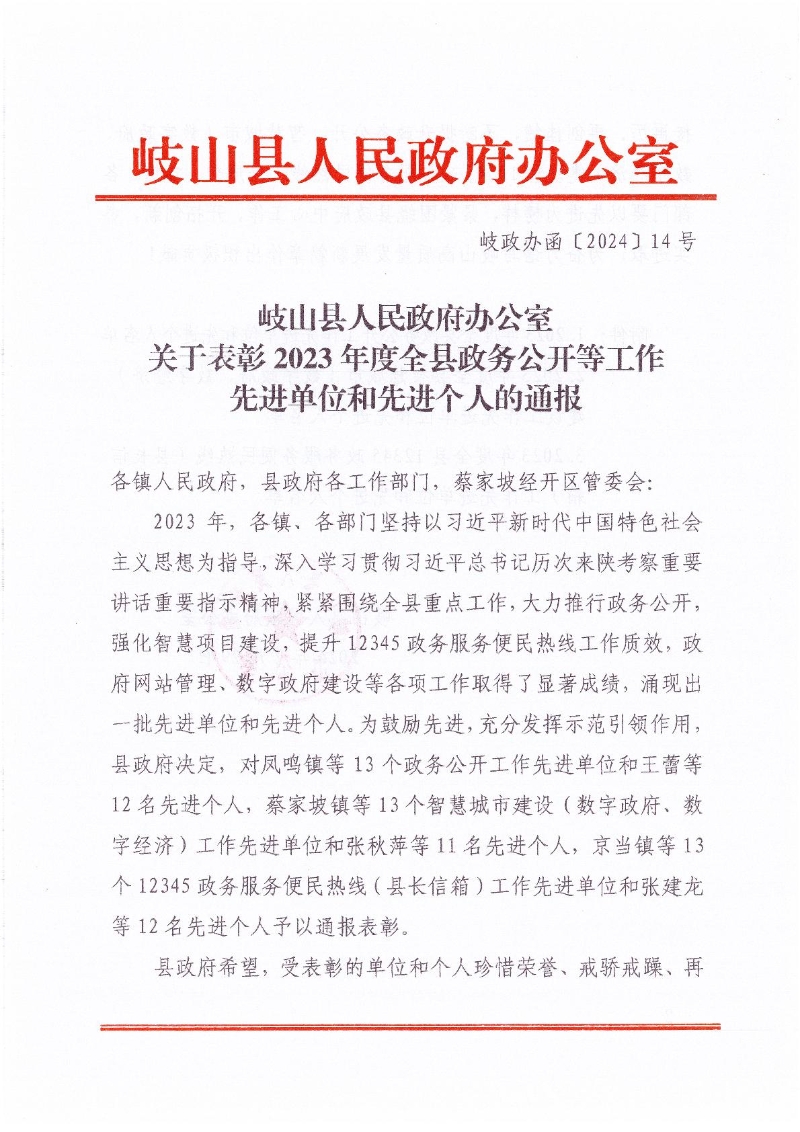 名  称: 岐山县人民政府办公室关于表彰2023年度全县政务公开等工作先进单位和先进个人的通报