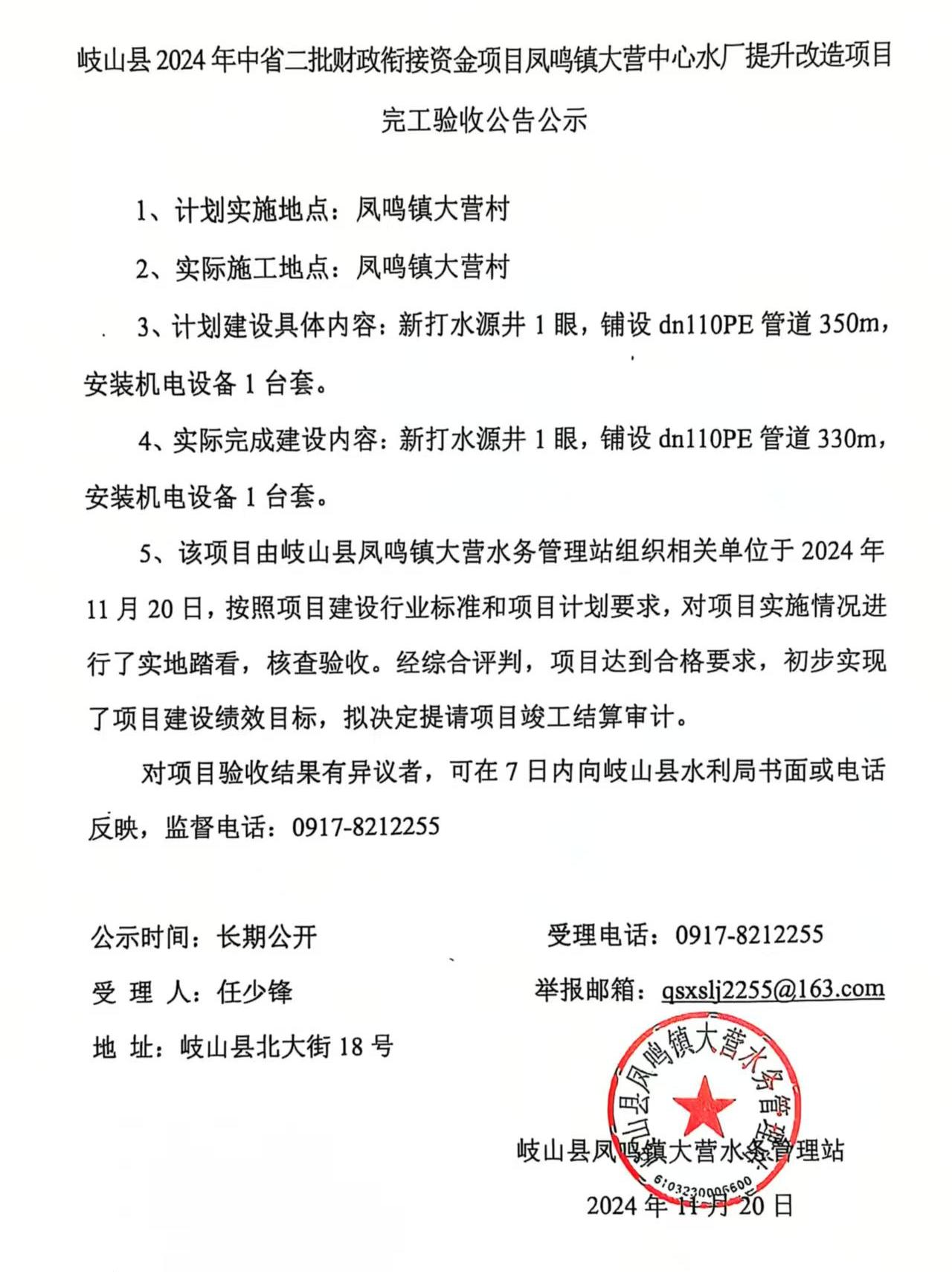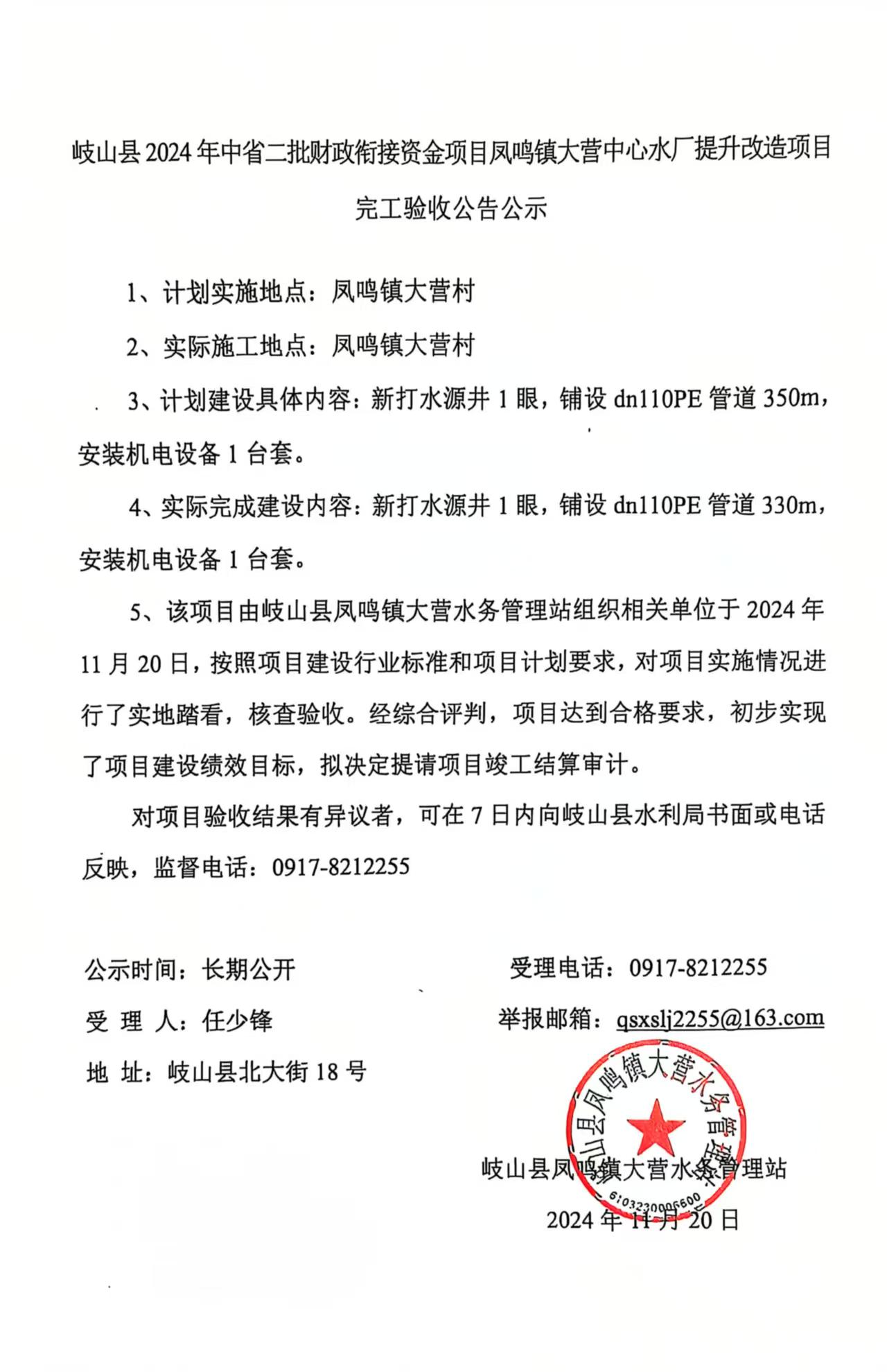 岐山县2024年中省二批财政衔接资金项目凤鸣镇大营中心水厂提升改造项目完工验收公告公示