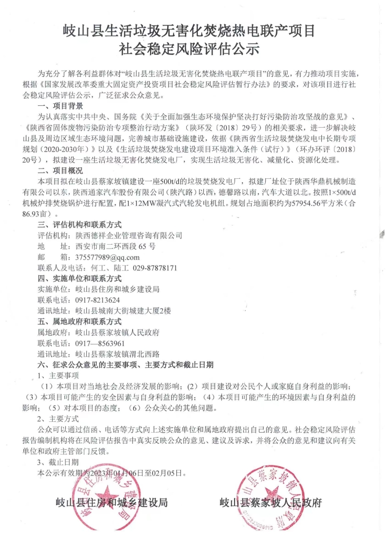 岐山县生活垃圾无害化焚烧热电联产项目社会稳定风险评估公示