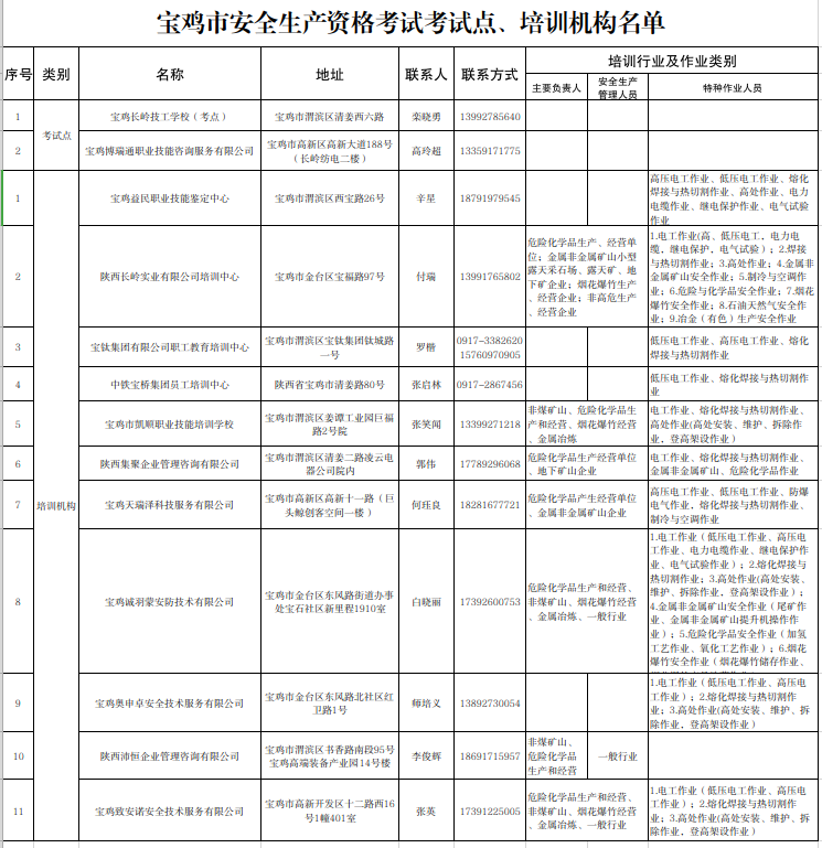 宝鸡市安全生产资格考试考试点、培训机构名单