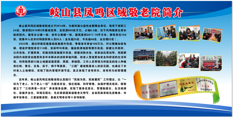岐山县凤鸣区域敬老院成立于2014年,为副科级公益性全额事业单位,现有干部职工24名。敬老院2016年5月建成投用,总投资900余万元,占地6.5亩,位于凤鸣镇原北郭乡政府院内,建有办公楼一栋;老年公寓楼一栋,建筑面积2817.78平方米,拥有床位150张。现集中入住农村特困供养人员93人(全失能25名、半失能46名,全自理22名)。