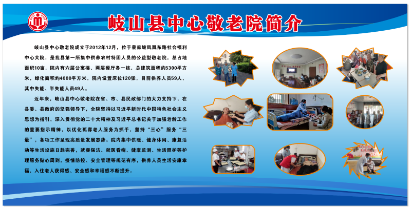 岐山县中心敬老院成立于2012年12月,位于蔡家坡凤凰东路社会福利中心大院,是我县第一所集中供养农村特困人员的公益型敬老院,总占地面积10亩,院内有六层公寓楼、两层餐厅各一栋,总建筑面积约5300平方米.绿化面积约4000平方米,院内设置床位120张,目前供养人员59人,其中失能、半失能人员49人。