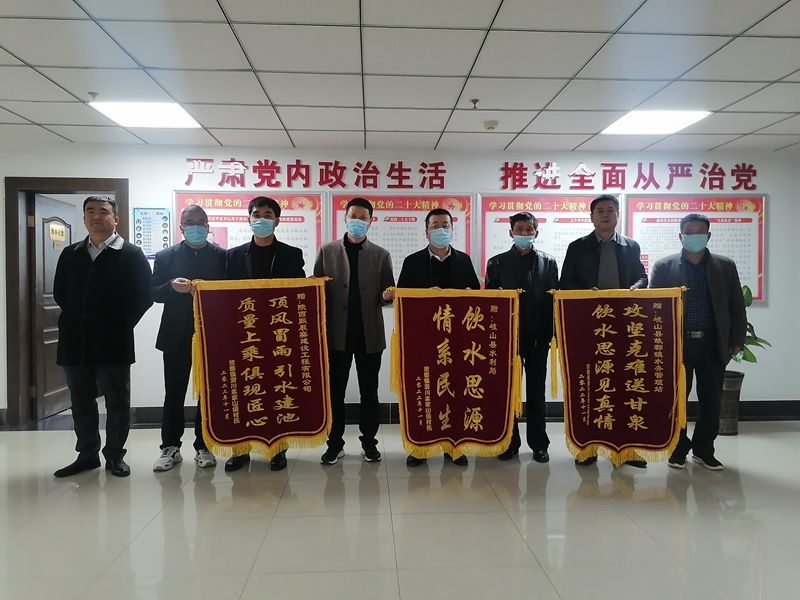 11月18日上午,故郡镇杜家村孟家山组村民将写着“饮水思源,情系民生”“攻坚克难送甘泉,饮水思源见真情”“顶风冒雨饮水建池,质量上乘俱现匠心”的三面锦旗送到岐山县水利局,以此感谢县水利局帮助孟家山组村民维修供水设施,确保饮水安全。