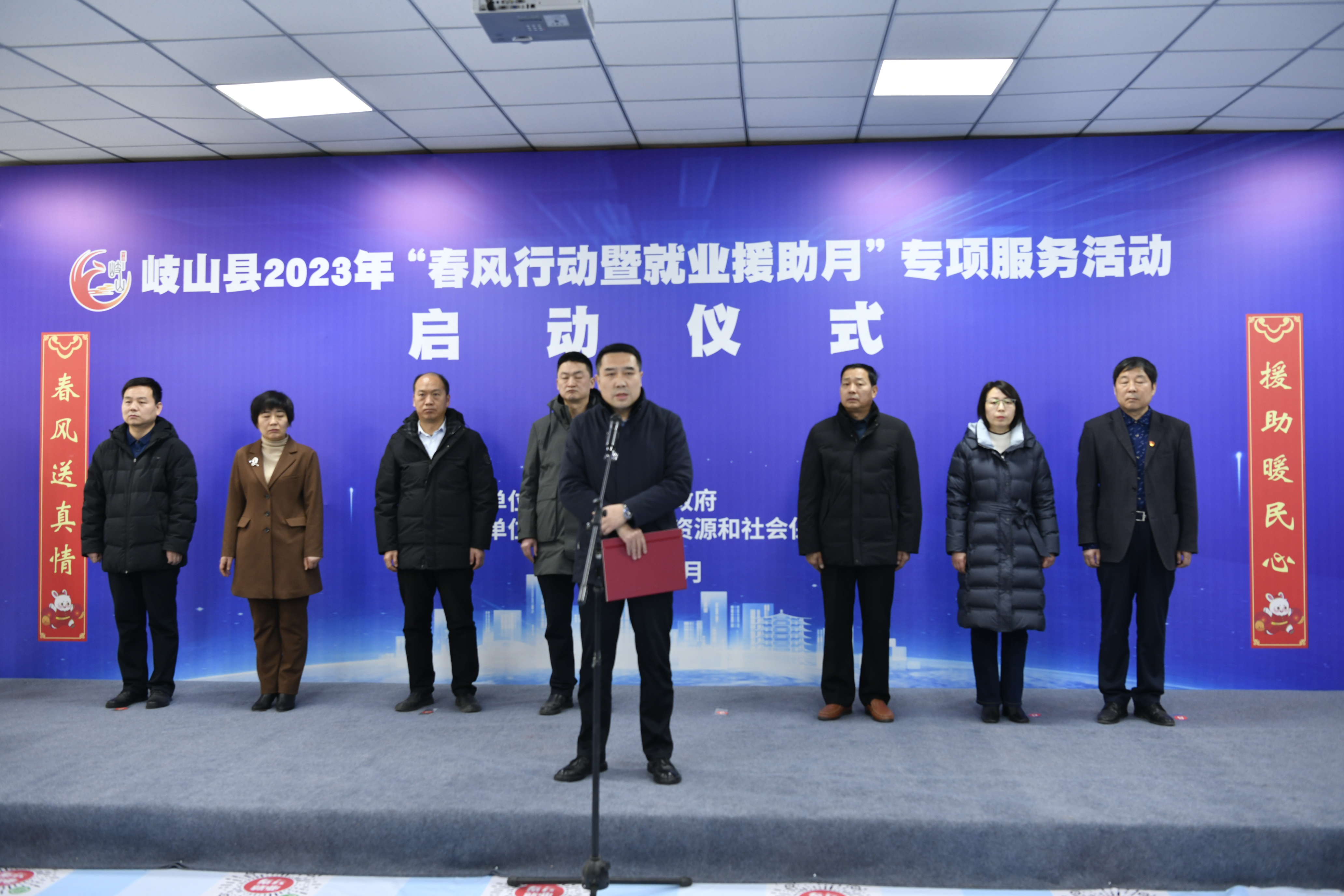 市人社局副局长王勇刚宣布岐山县2023年“春风行动暨就业援助月”专项服务活动启动。
