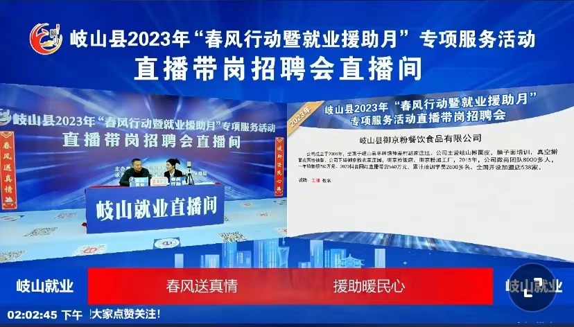 继春节前“迎新春送岗位暖民心”直播带岗活动之后,1月28日收假第一天,由岐山县人民政府主办、岐山县人力资源和社会保障局承办的岐山县2023年“春风行动暨就业援助月”专项服务活动率先在全市拉开序幕。