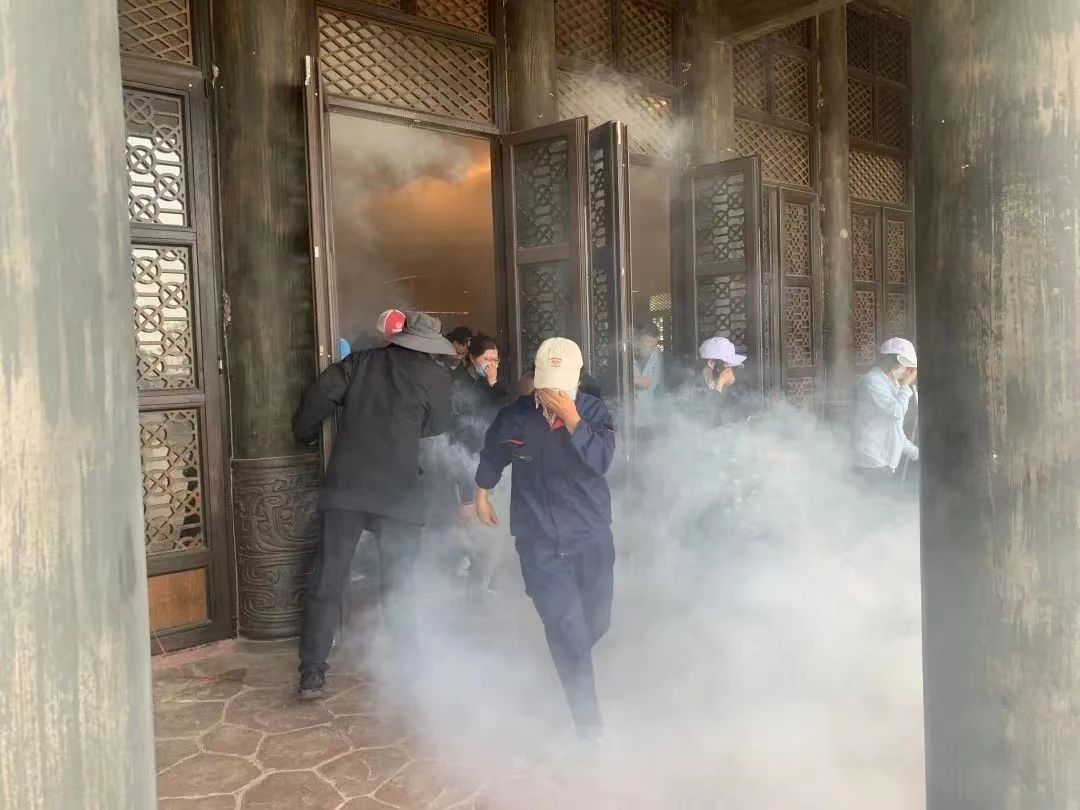 演练前,县消防救援大队结合火灾真实案例,向景区员工进行景区消防安全及逃生自救疏散要领等安全常识培训,随后现场有序开展疏散逃生演练。疏散演练结束后,统一在周公庙明堂集结,讲解初起火灾的扑救,灭火器使用方法,并指导现场员工实地操作使用干粉灭火器灭火。最后,观看消防安全常识展板内容及消防人员发放消防知识宣传手册。