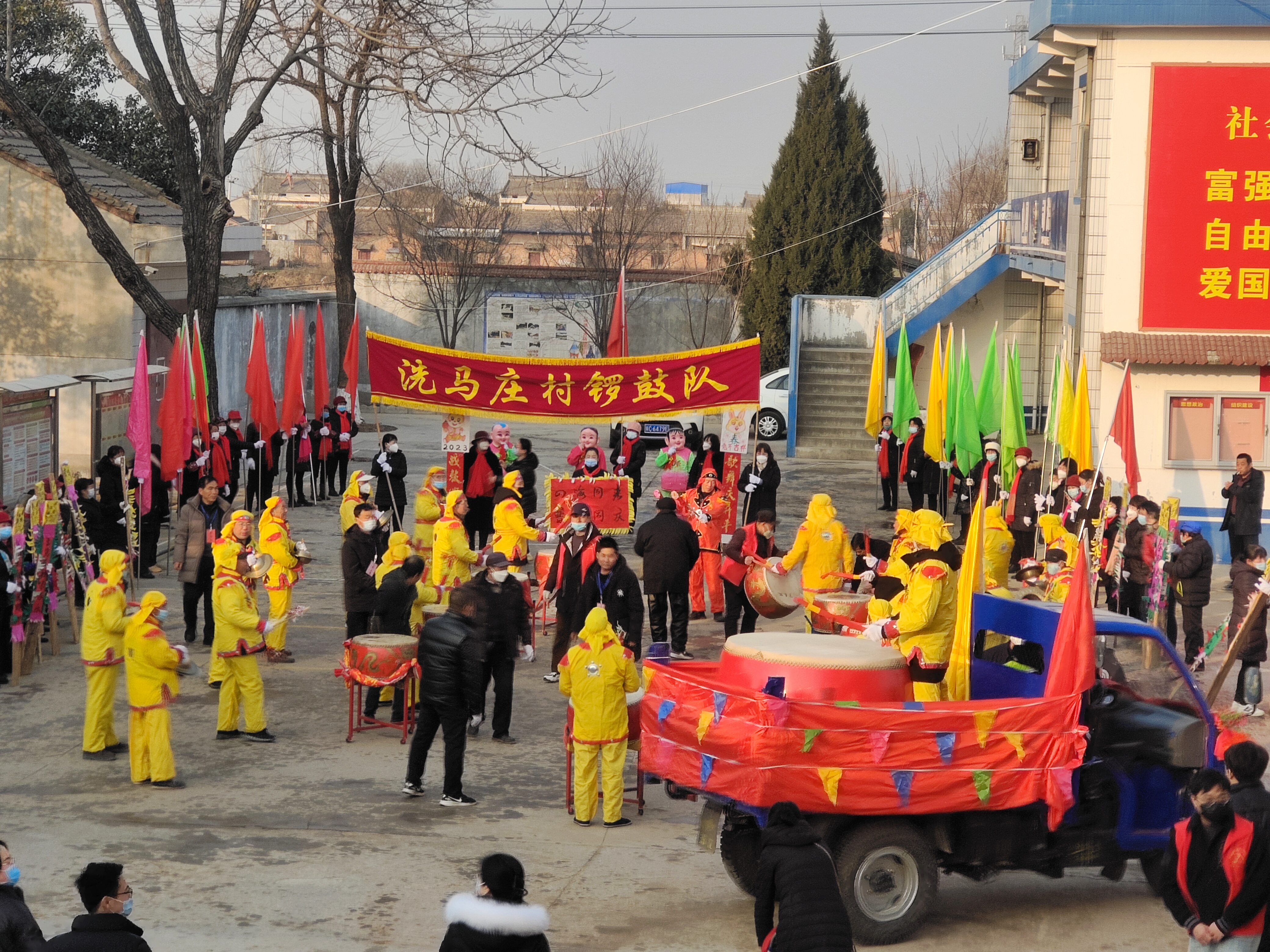110名锣鼓表演者来自蒲村镇洗马庄村,全部由农民组成,平均年龄55岁,大中小三种鼓一起擂动,依次绕镇区游演。催人奋进的鼓鸣声响彻蒲村镇街道上空,威风锣鼓方阵,气势恢宏,古朴典雅,表演细腻,表演的队员们身着盛装,伴着铿锵的锣鼓,鼓槌翻腾、身姿腾挪、神采飞扬,用极具震撼力的鼓声敲出了太平盛世的时代强音,以洒脱矫健的舞姿彰显奋发图强的劳动精神,让观众赏心悦目、荡气回肠。